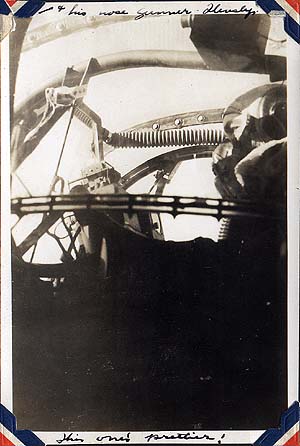 Pifer continued, “On leaving the aircraft, I righted myself, counted ten seconds because of the altitude and pulled the rip cord. Nothing happened! Probably instinct prompted me to clutch at the flap of my chestpack. After what seemed like an interminable lapse of time, the pilot chute blossomed forth past my face and then the main chute opened with a tremendous jerk on my body. I experienced exquisite right groin pain and nearly fainted. This was caused by carelessness on my part, a loose harness strap. However it was good to be alive and I silently gave thanks to the Lord. I became aware of the B-24 spiraling around me in tight concentric circles, constantly losing altitude, its engines silent. A parachute opened above me. The aircraft continued to drop and finally crashed and exploded in flames on the side of a small wooded hill.” Pifer landed in a harvested cornfield. He was still in pain and had difficulty spilling his chute which dragged him across a row of sharp 8 inch corn stalks. Finally the wind died down enough to enable him to corral and fold the chute. Pifer stood up and freed himself from the harness which immediately eleviated some of his pain. He saw Lt. Markewitz touch down about one-hundred yards away and they quickly joined each other in the field. Shortly they were joined by several of the other crew members who had also landed near by. They lighted cigarettes and started to plan their next move, not sure if they were in liberated France or enemy occupied territory. ![]() ![]() Before they had time to react they were surrounded by several heavily armed civilians, who, fortunately for the crewmen, turned out to be Free French resistance fighters. They had come down near the village of St. Blin. Soon it was discovered that their nose-gunner, David Hensley was killed on impact when his chute didn’t open. As they compared notes it seemed that four of them had experienced the same failed chute opening when they first pulled the ripcord. The mission navigator sustained crush fractures in his right heel and Pifer had a partial fracture of his right pubic bone. They were both taken to the 23rd General Hospital in Vittel which had been a hotel and was converted by the Army. The navigator was returned to the States for his injuries but Pifer’s injury was deemed mild enough for him to return to his crew at Bungay. Back at Bungay during de-briefing, it was determined that the chutes had failed because they had frozen at the extreme altitude. (Right) Nose Gunner, David Hensley in his turret over enemy territory. ![]() ![]() Somewhere in England, 1 February, 1945 Dearest Sweetheart, I love you....."I'm in sad shape today. I'm filthy, I need a shave. There's no water on the post. The electricity just went out, killing the radio, the fire is out, and while there's still some coal there's no wood, so things are getting rough in the ETO.....I don't remember if I ever told you how many missions we fly for a tour, anyway. I'm not supposed to, so if I haven't I won't. I don't think I'll tell you how many missions I've got either. There's no use your sweating them out too. I've got the air medal and a cluster for it, that's all I'll say... ![]()